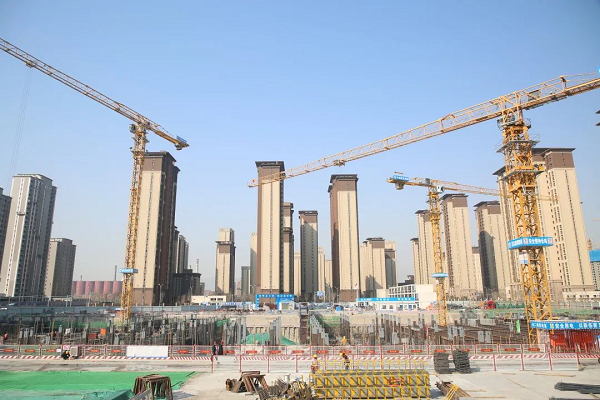 走进工地,一个巨大的基坑映入眼帘,随处都是忙碌施工的工人和大型器械。伴着微微轰鸣声,3台塔吊正在接续不断地向基坑内吊运建筑材料,工人们正在进行地下一层、地下二层的钢筋绑扎作业,工程进展紧张有序、忙而不乱。